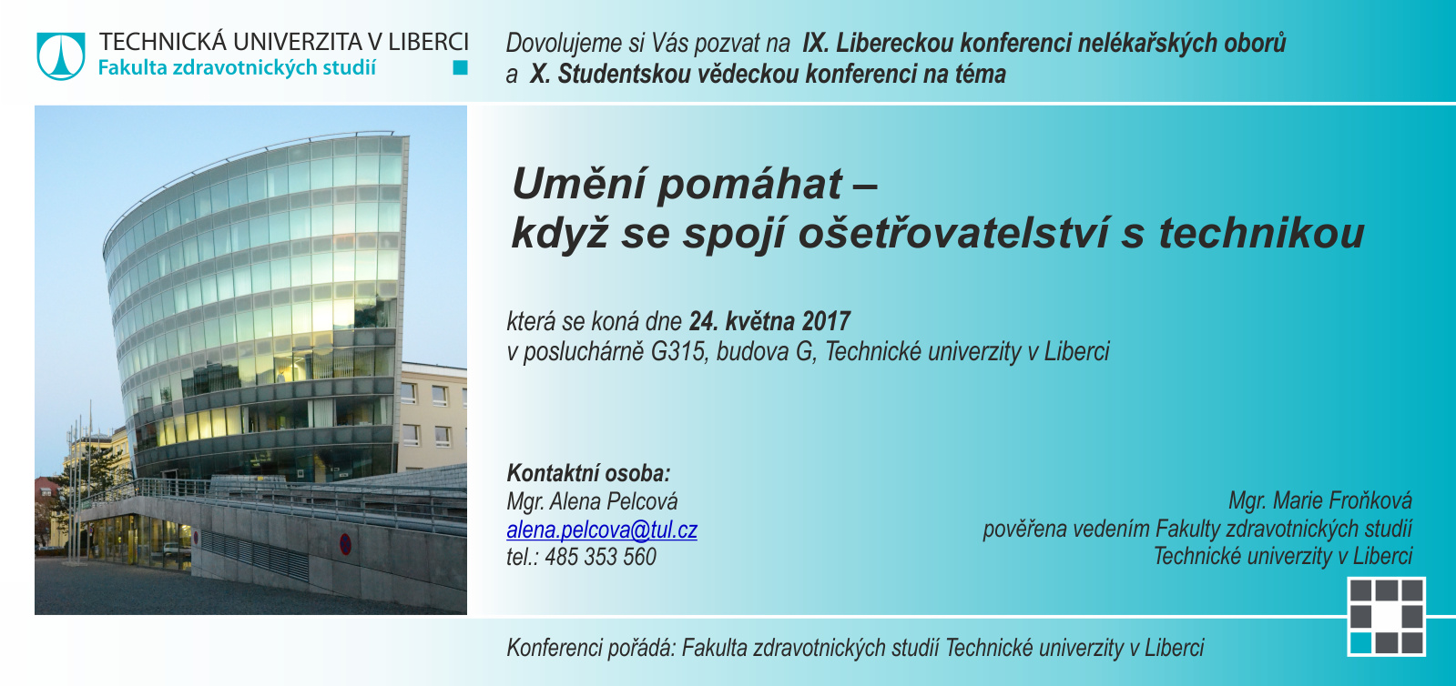Dovolujeme si Vás srdečně pozvat na IX. Libereckou konferenci nelékařských oborů na téma "Umění pomáhat – když se spojí ošetřovatelství s technikou" a X. Studentskou vědeckou konferenci, která se koná dne 24. 5. 2017 v posluchárně G315 budovy G na TUL.